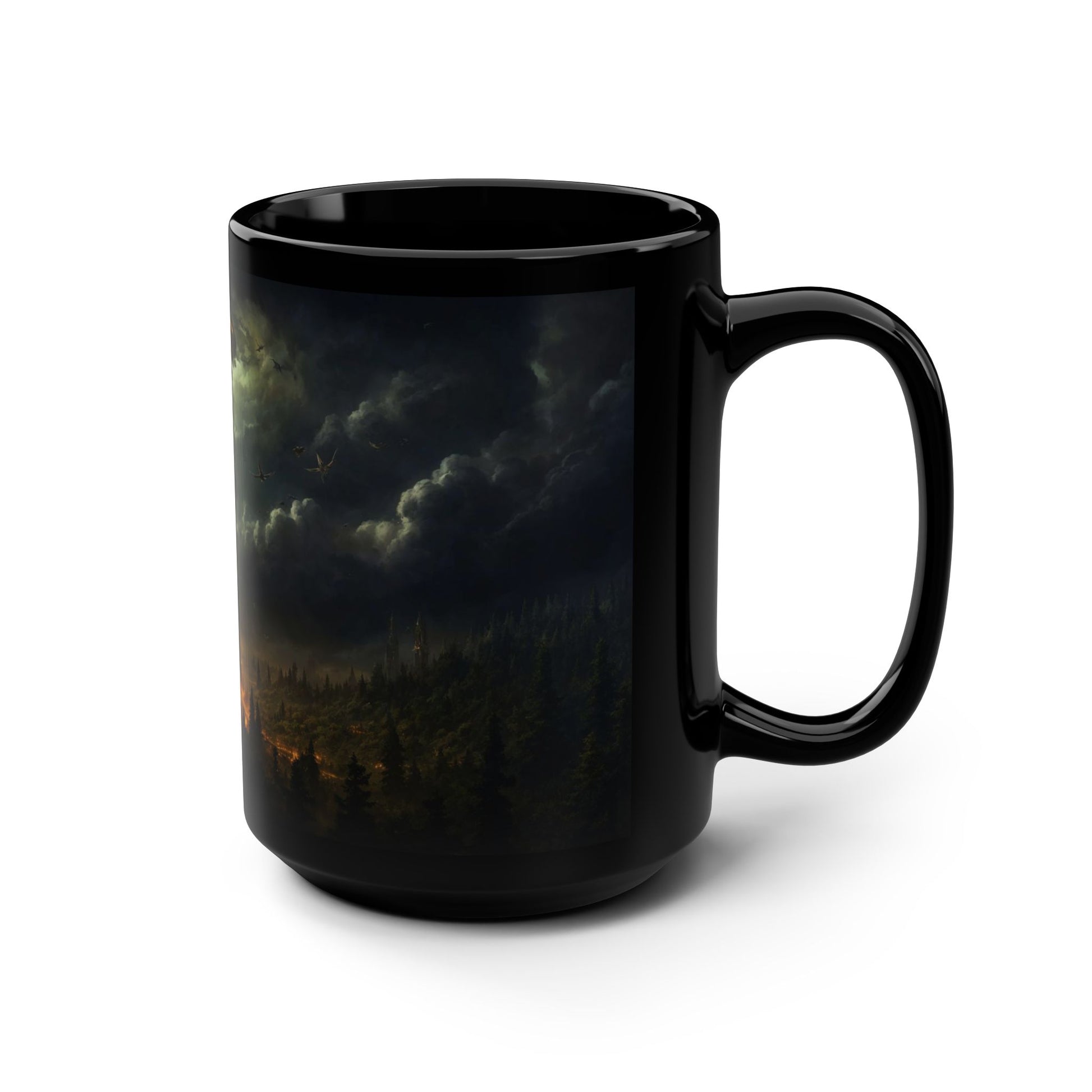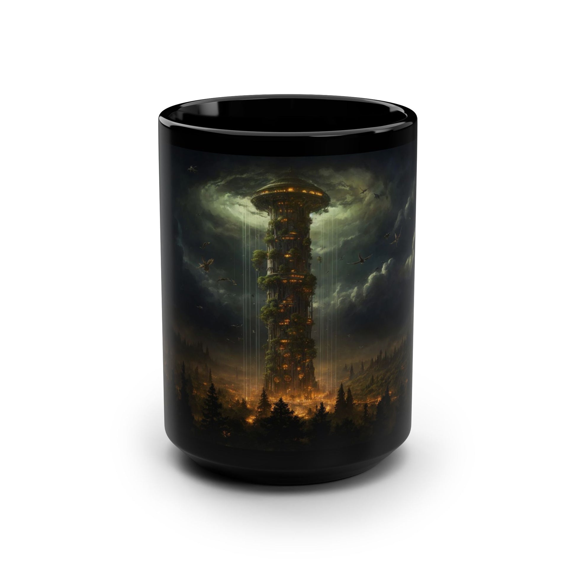 A towering, vine-choked alien monolith pierces a tempestuous sky, glowing warmly against bruised clouds. Below, a forest glows with eerie amber light, while birds circle the impossible structure. This hauntingly beautiful scene, rendered in rich, atmospheric detail, transforms your mug into a portal to a forgotten world. The art’s moody depth and cinematic scale invite quiet wonder with every sip.