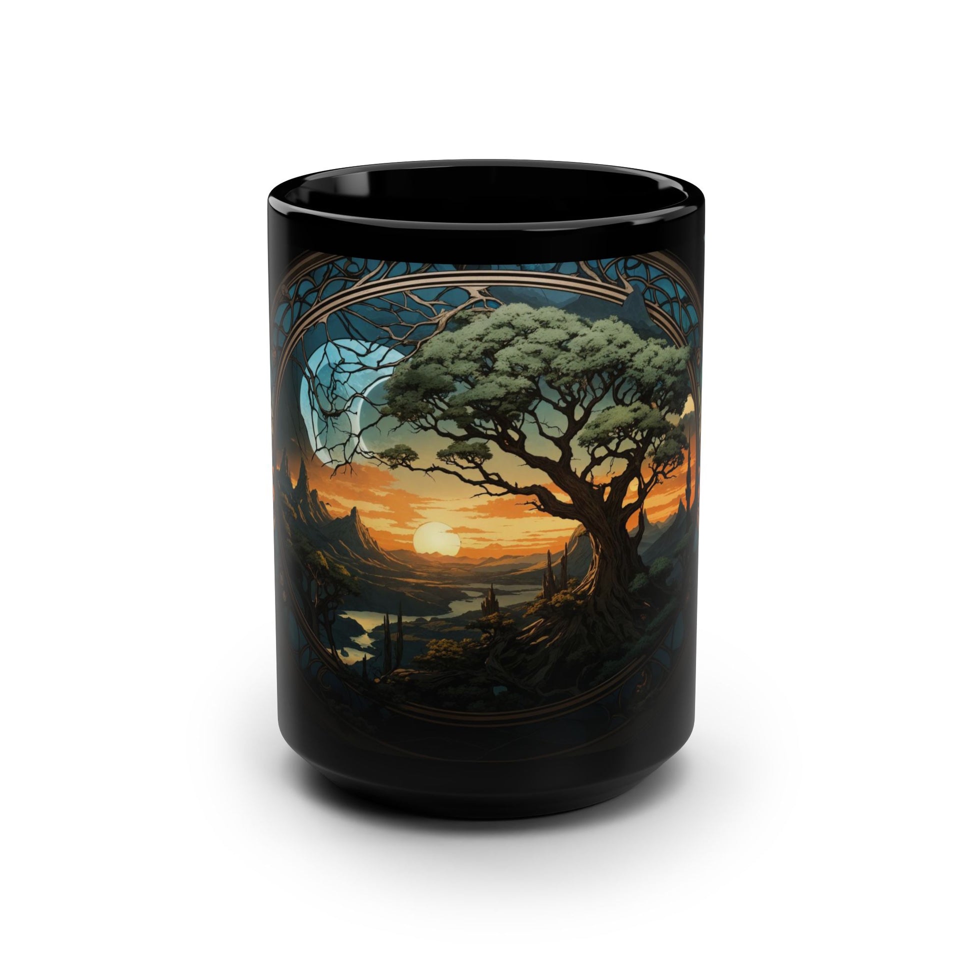 Watch the sun dip below misty peaks as an ancient, gnarled tree stands sentinel over a serene valley. Its sprawling branches frame a twilight sky, glowing with warm oranges and cool blues. The intricate, vine-like border adds mystical depth. This evocative scene invites quiet reflection, transforming your daily coffee into a moment of tranquil wonder.