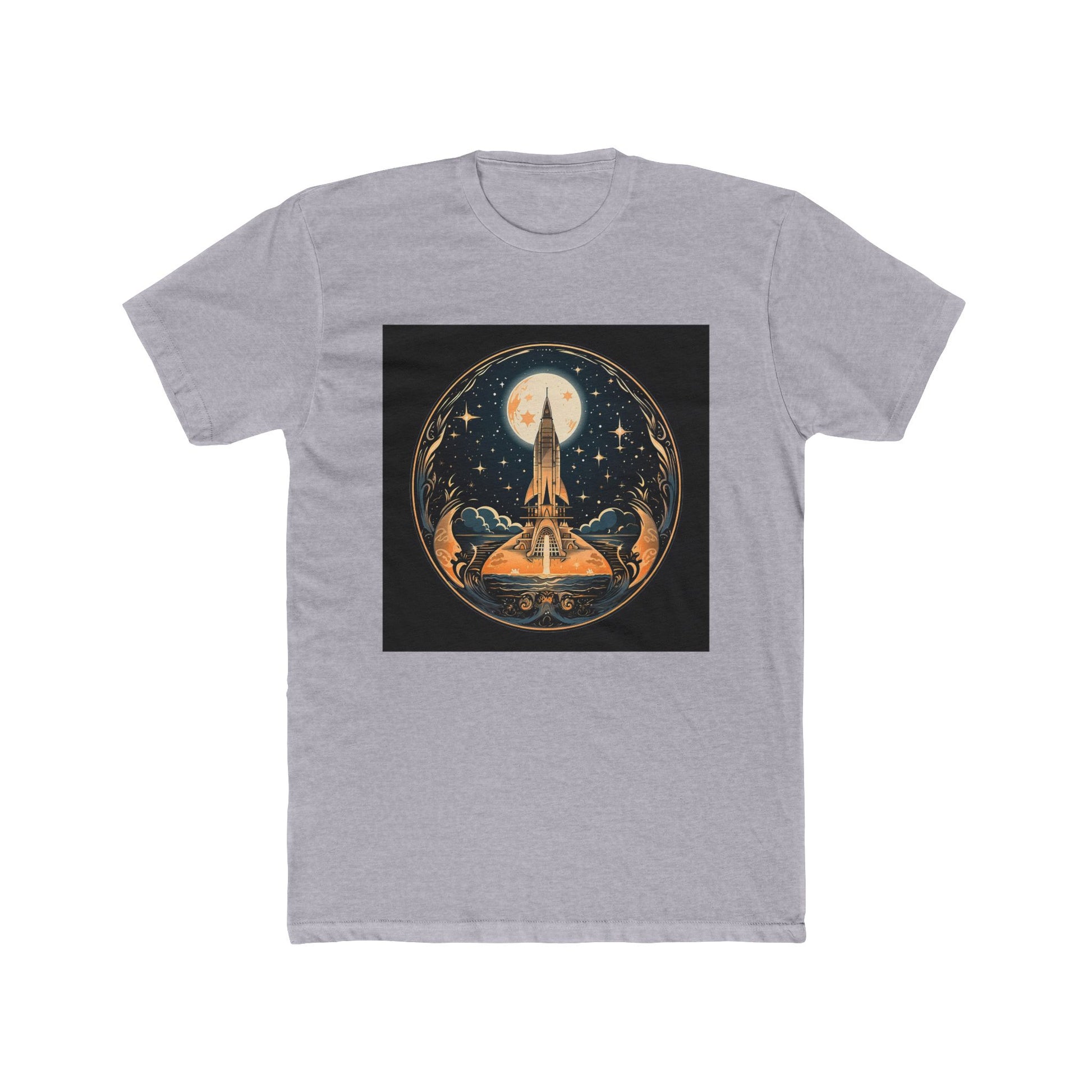 A surreal rocket ascends from an ornate, glowing platform beneath a star-studded sky. Twin crescent moons frame the scene, glowing amber against deep indigo clouds. The celestial design radiates wonder and quiet ambition. Wearing this shirt feels like carrying a dream of cosmic adventure—art that whispers of wonder, not just shouts.