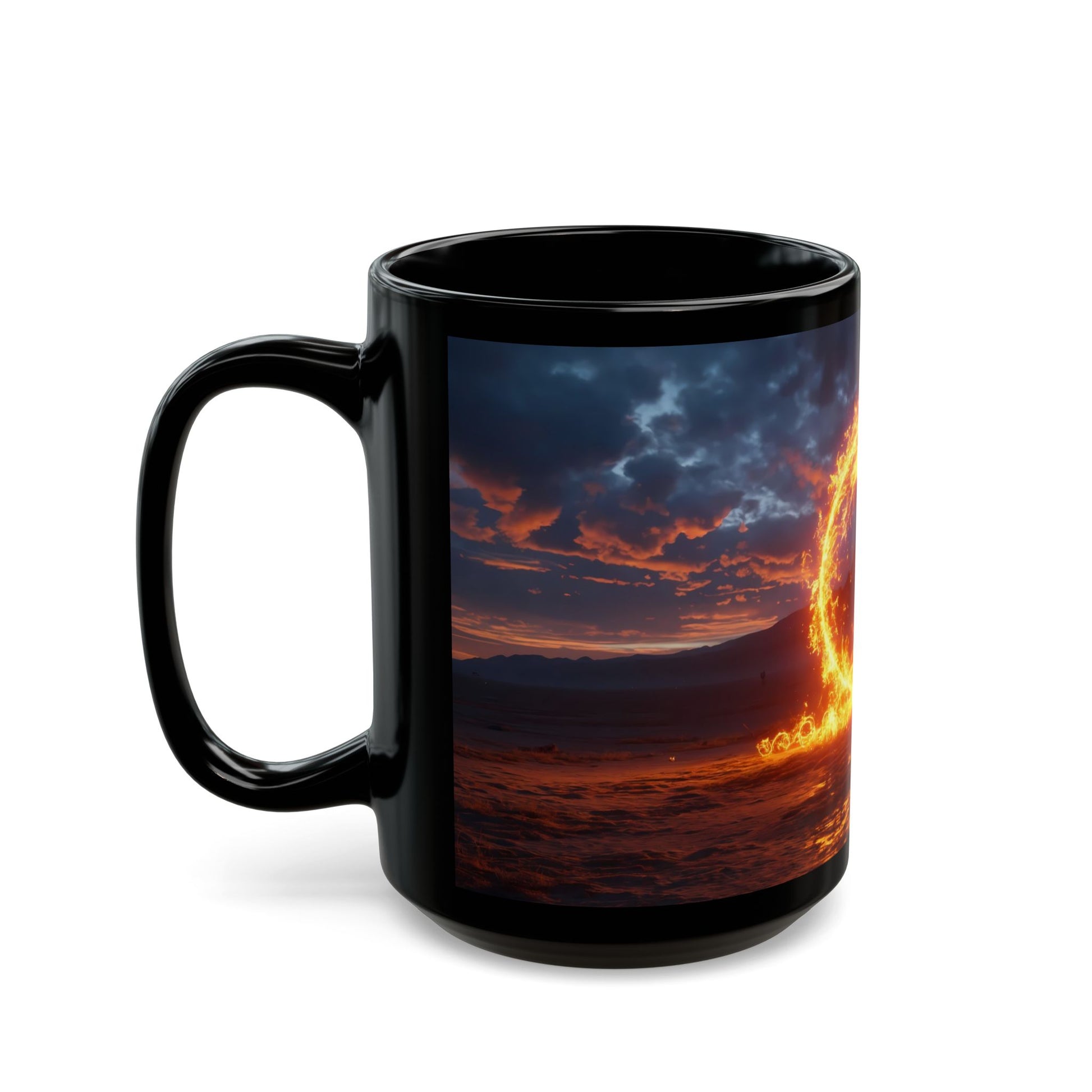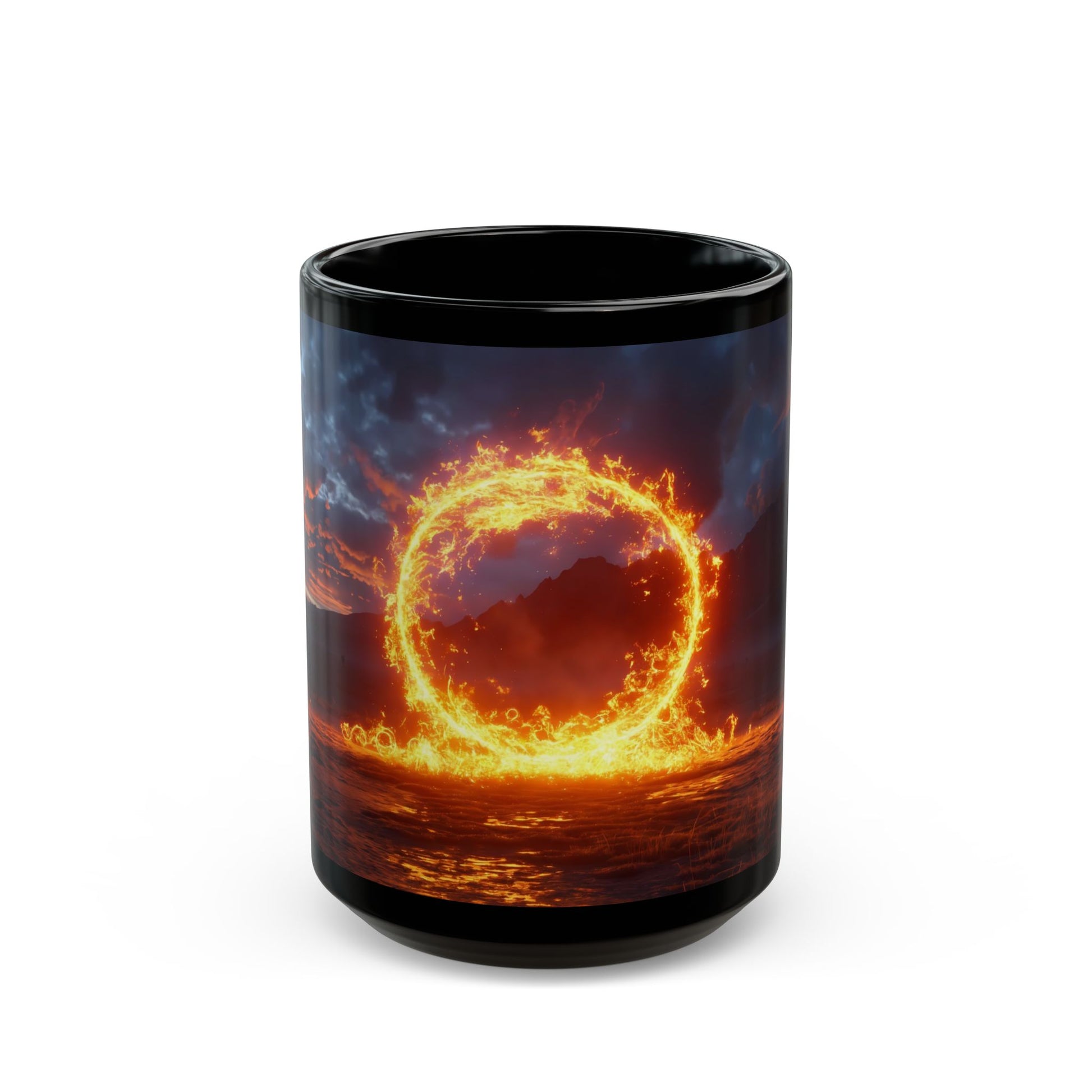 Wrap yourself in the hush before dawn. This glossy black mug holds a vision of a perfect, blazing ring of fire suspended over a vast, twilight plain—its molten core casting a warm, orange glow across the damp earth and distant, snow-dusted peaks. The sky above, bruised with deep indigo and streaked with fiery orange, frames the portal as if nature itself has carved a doorway. The smooth ceramic cradles your hands with a cool, matte finish, making each sip feel like a quiet pause in a story of wonder. Pour your morning brew, savor a late-night snack, or hold it while reading under a lamp—let the warmth of the portal’s light linger in your hands and your spirit.