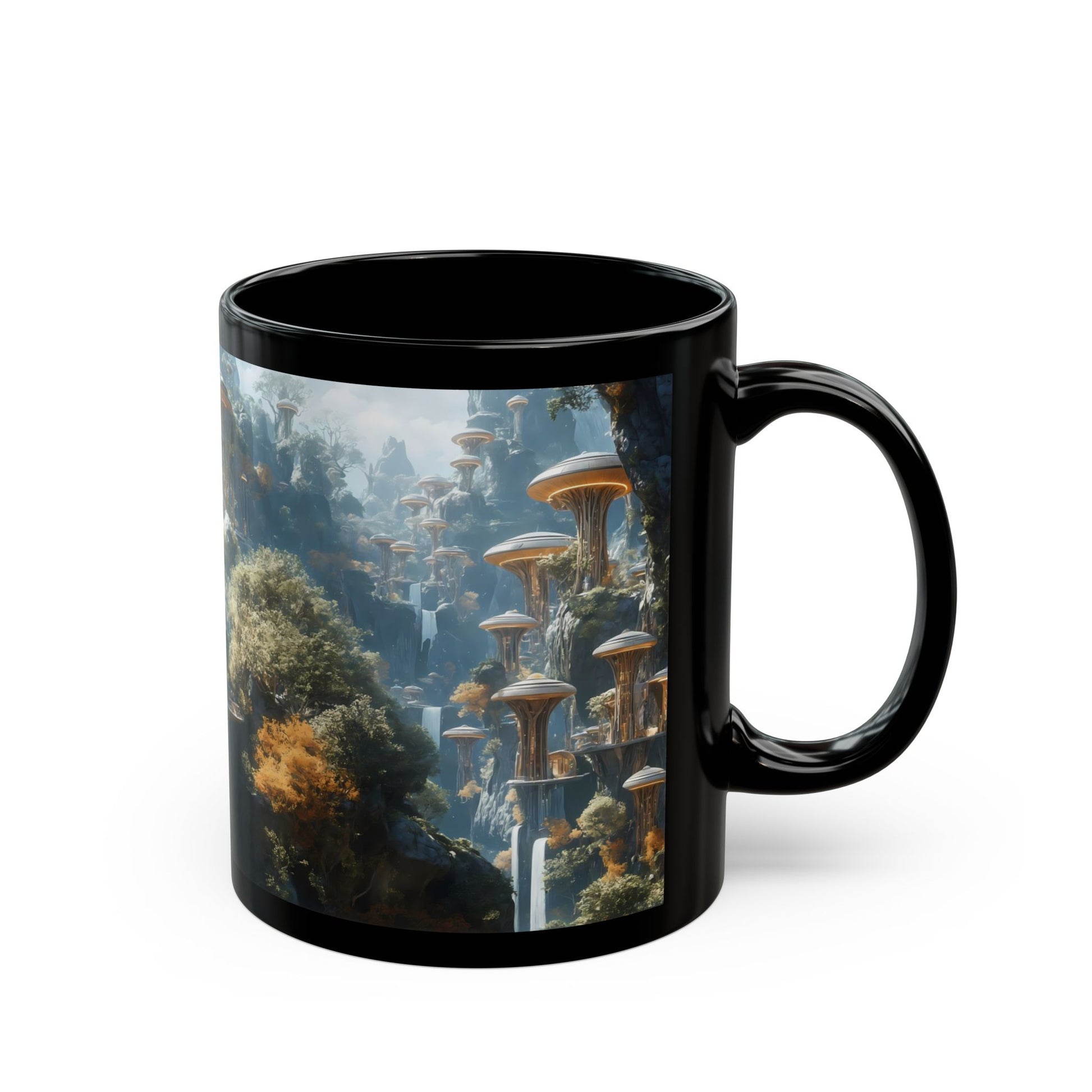 Floating Dome Village Black Mug – Sunlit Sky-Cliff Haven