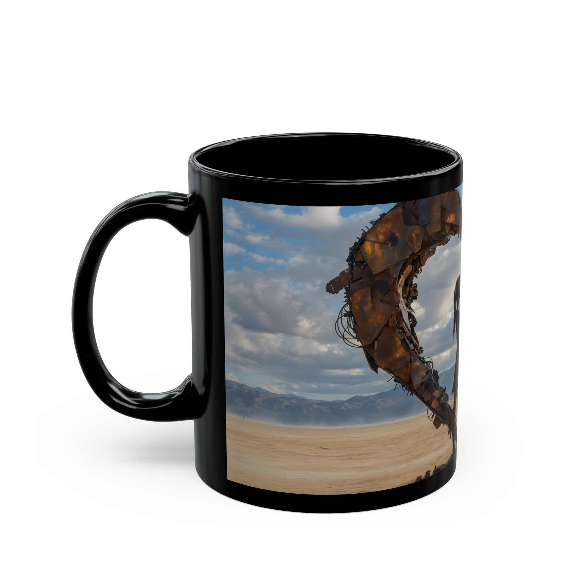 An AI-crafted romance unfolds as a couple’s silhouette cradles a driftwood heart against sunset hues. Feel the warmth of whispered promises and salt-kissed air—this mug holds more than coffee; it holds a moment made eternal by nature’s artistry.