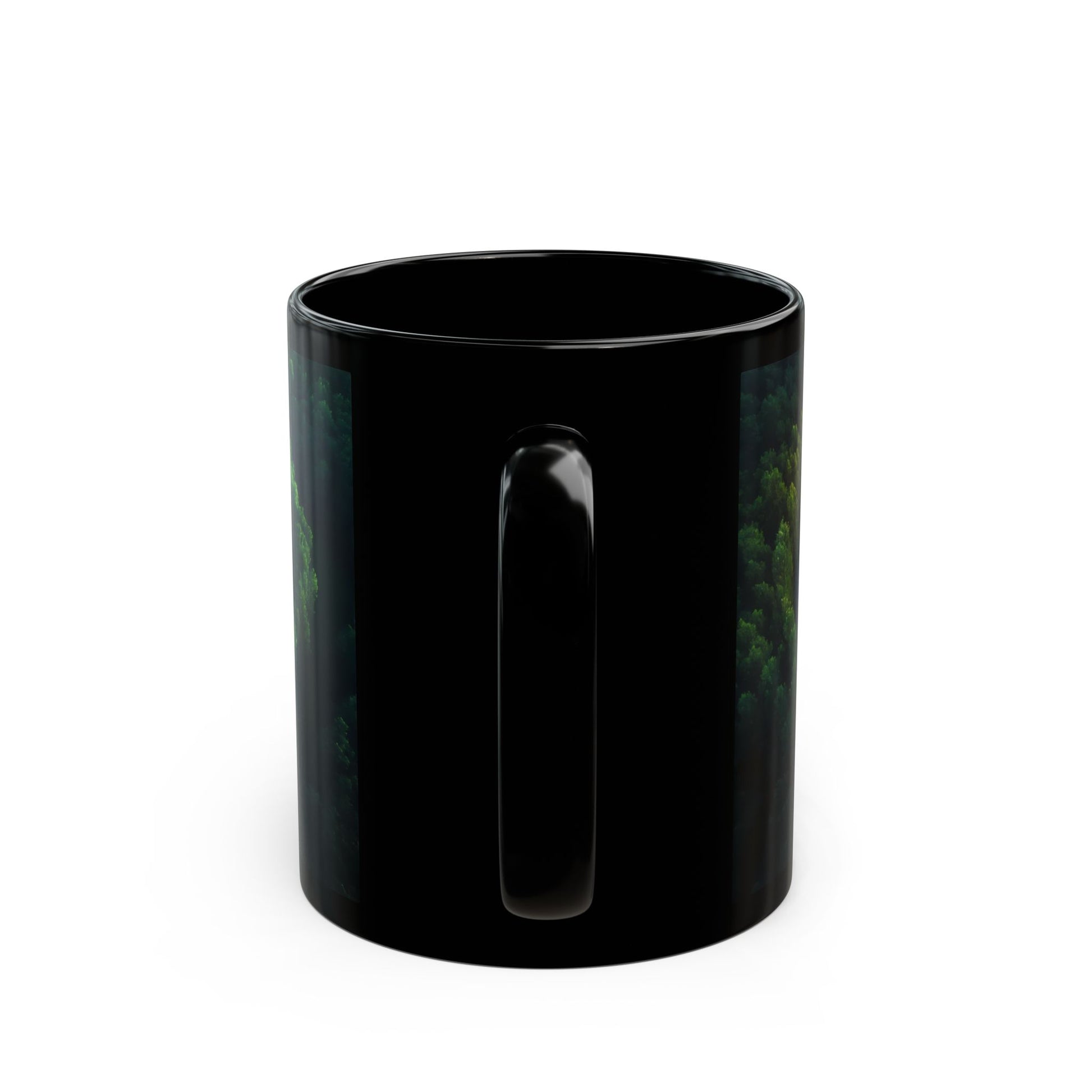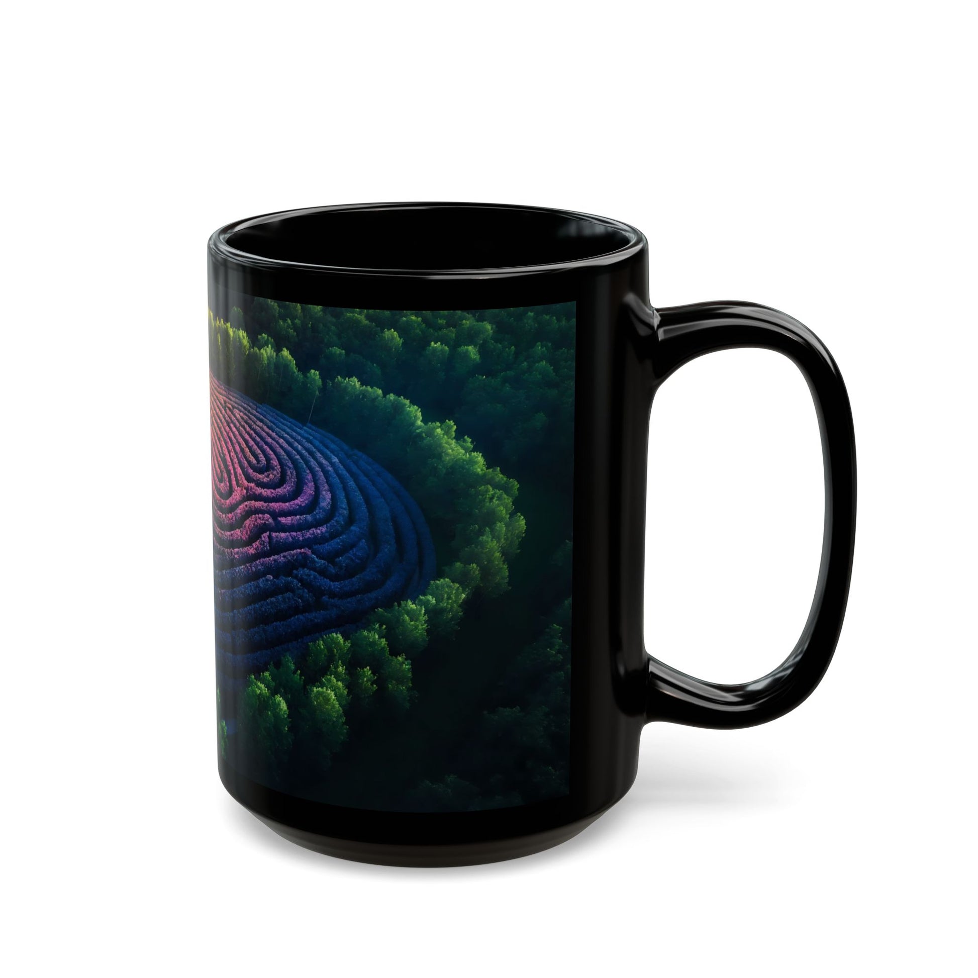 Wrap yourself in a quiet, sun-dappled mystery. This glossy black mug holds a breathtaking aerial view of a circular maze woven from blooming flowers, its paths shifting from fiery coral to deep indigo like a living rainbow. Surrounded by a dense, emerald forest, the scene feels like a hidden sanctuary discovered at dawn – hushed, deeply calming, and built for someone who finds peace in quiet patterns. The smooth, C-shaped grip feels cool and solid in hand, perfect for morning coffee or evening tea. Let it sit beside your journal, on your desk during a long workday, or beside your favorite book as a quiet reminder of hidden beauty and mindful wandering. It whispers that your path, too, holds quiet wonder.