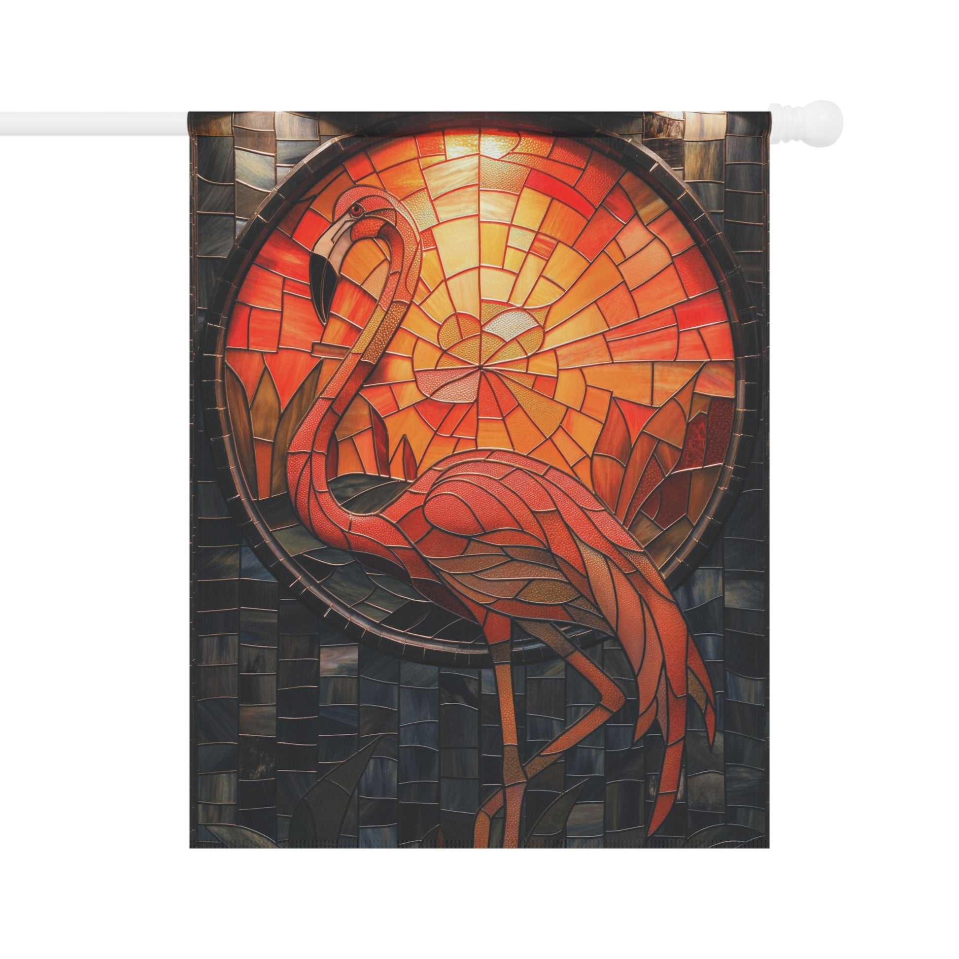 Witness a flamingo poised in serene grace, rendered in radiant stained glass hues of amber, coral, and molten gold. Set against a sunburst backdrop and dark, textured foliage, the artwork exudes warmth and quiet elegance. This garden flag transforms your outdoor space into a tranquil, artistic sanctuary—perfect for adding vibrant, story-rich beauty to patios, fences, or garden beds.