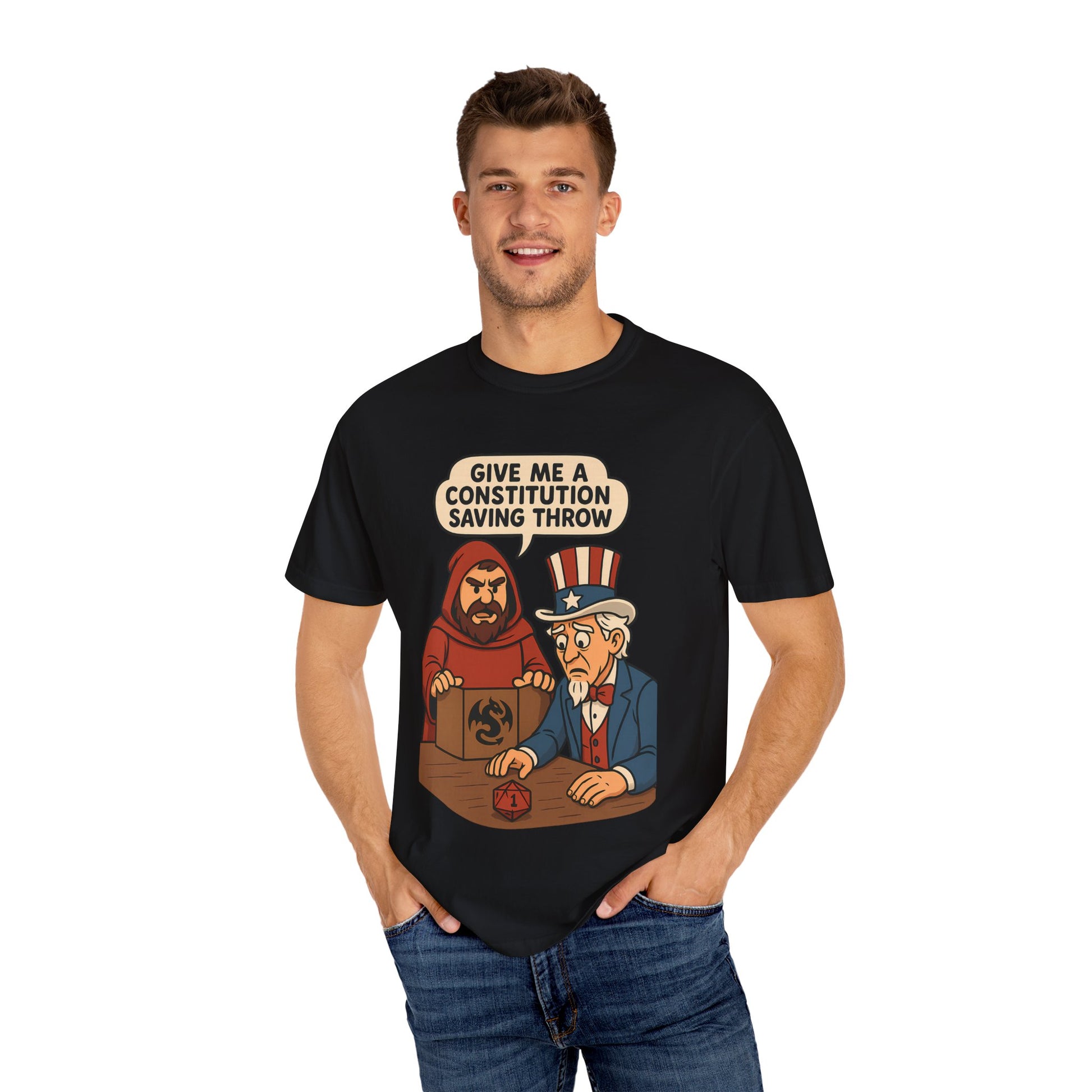 A tense tabletop moment unfolds: a bearded dragonlord in red robes demands a “Constitution Saving Throw” from a startled Uncle Sam. The red d20 rests on the wooden table, the Dragon’s Eye logo on the box hinting at fantasy stakes. The cartoonish style blends Americana with D&D humor, creating a whimsical yet dramatic scene perfect for fans of both worlds.
